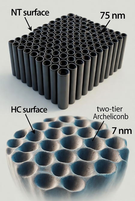 effects of two anodized titanium surfaces – a conventional nanotubular (NT) surface (∼75 nm diameter) and a two-tier honeycomb (HC) architecture – on the response of human MG63 osteoblastic cells. The HC surface, characterized by higher spatial entropy and a complex arrangement of smaller nanotubes (∼7 nm in diameter) clustered within larger domains (∼109 nm in diameter), significantly enhances early cellular